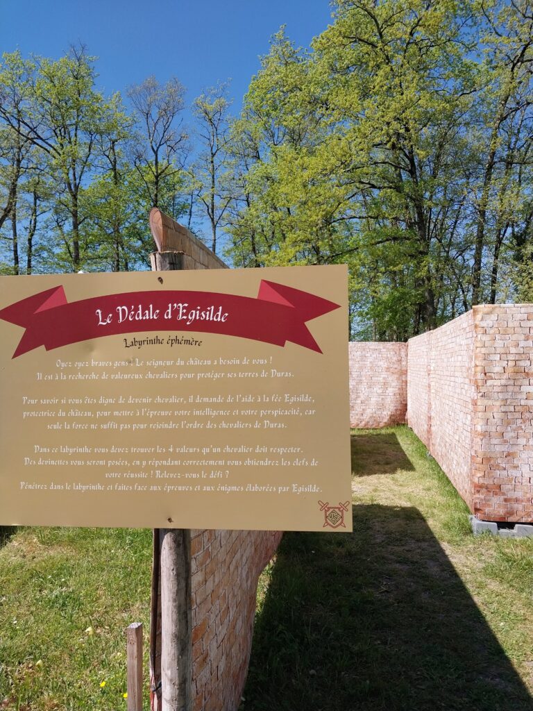 Deux choix s’offrent à vous : amusez vous à trouver la sortie ou laissez-vous tenter par le parcours d’énigmes « Le dédale d’Egisilde ». Bravez les épreuves et les énigmes élaborés par la fée Egisilde et prouver que vous êtes digne de devenir un chevalier de Duras !